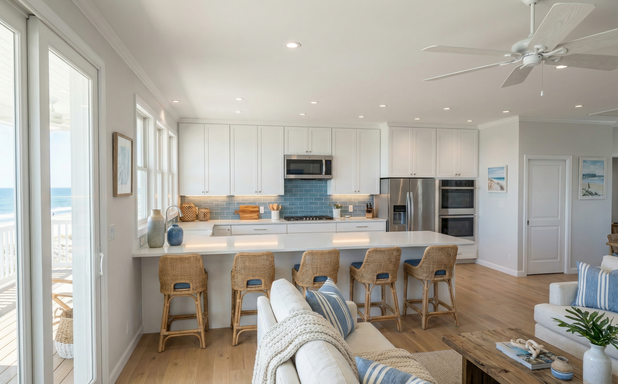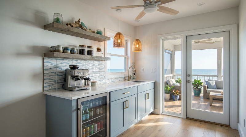 The home features both a first and second floor en suite, a private outdoor shower, and an upper floor coffee bar just off the screened-in balcony.