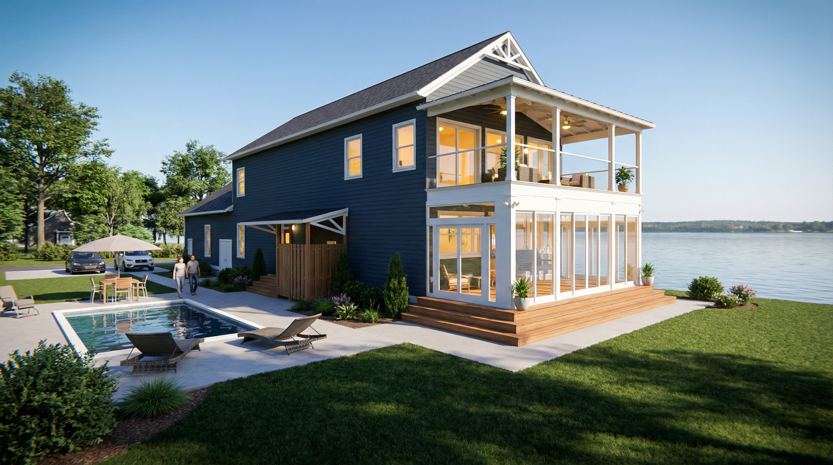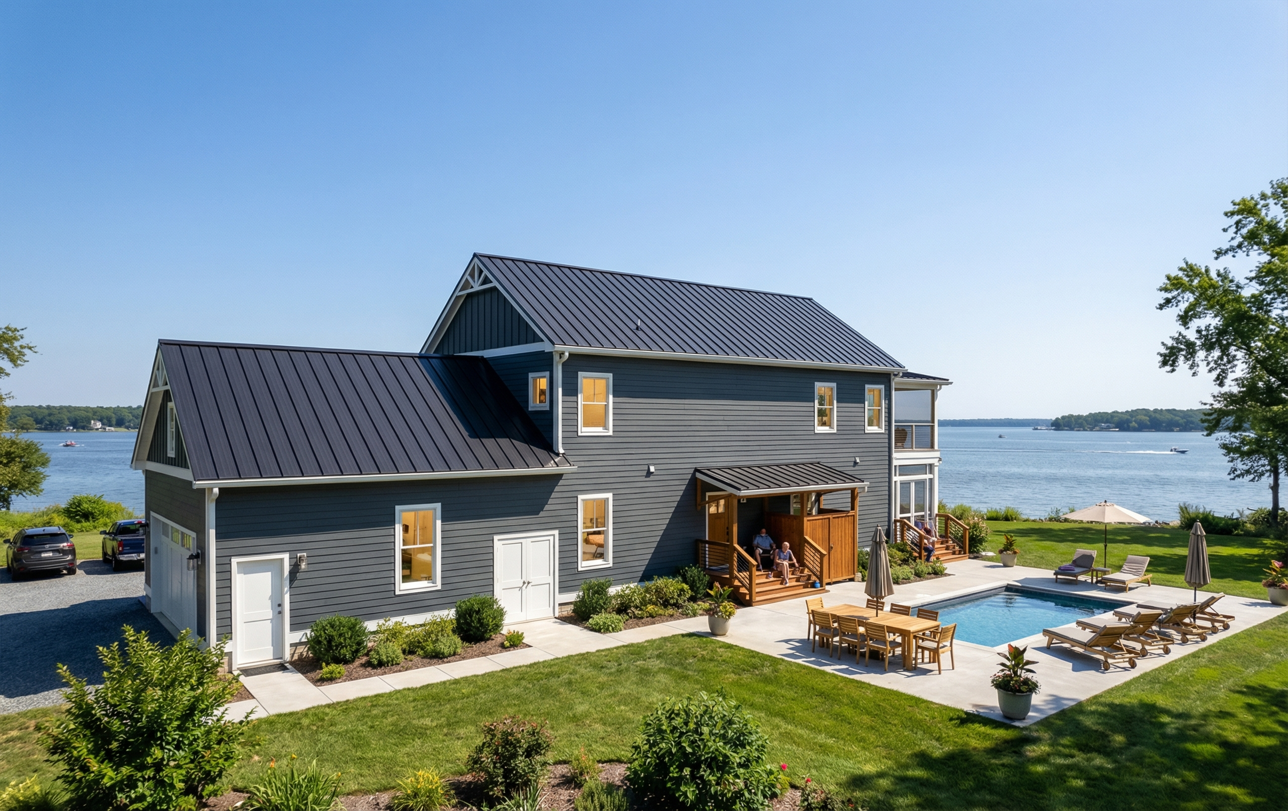 The compact and simple building envelope let us create an energy efficient and sustainable getaway that will be low cost and low maintenance for years to come, while still having ample storage for wintering their boat in the garage.